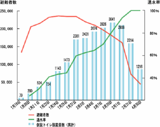 上下水道が破壊された場合、トイレは深刻な問題となります。阪神・淡路大震災では仮説トイレを被災翌日に79基しか設置できていません。これはピーク時の約40分の1の数で、多くの被災者はトイレ問題と直面しました。